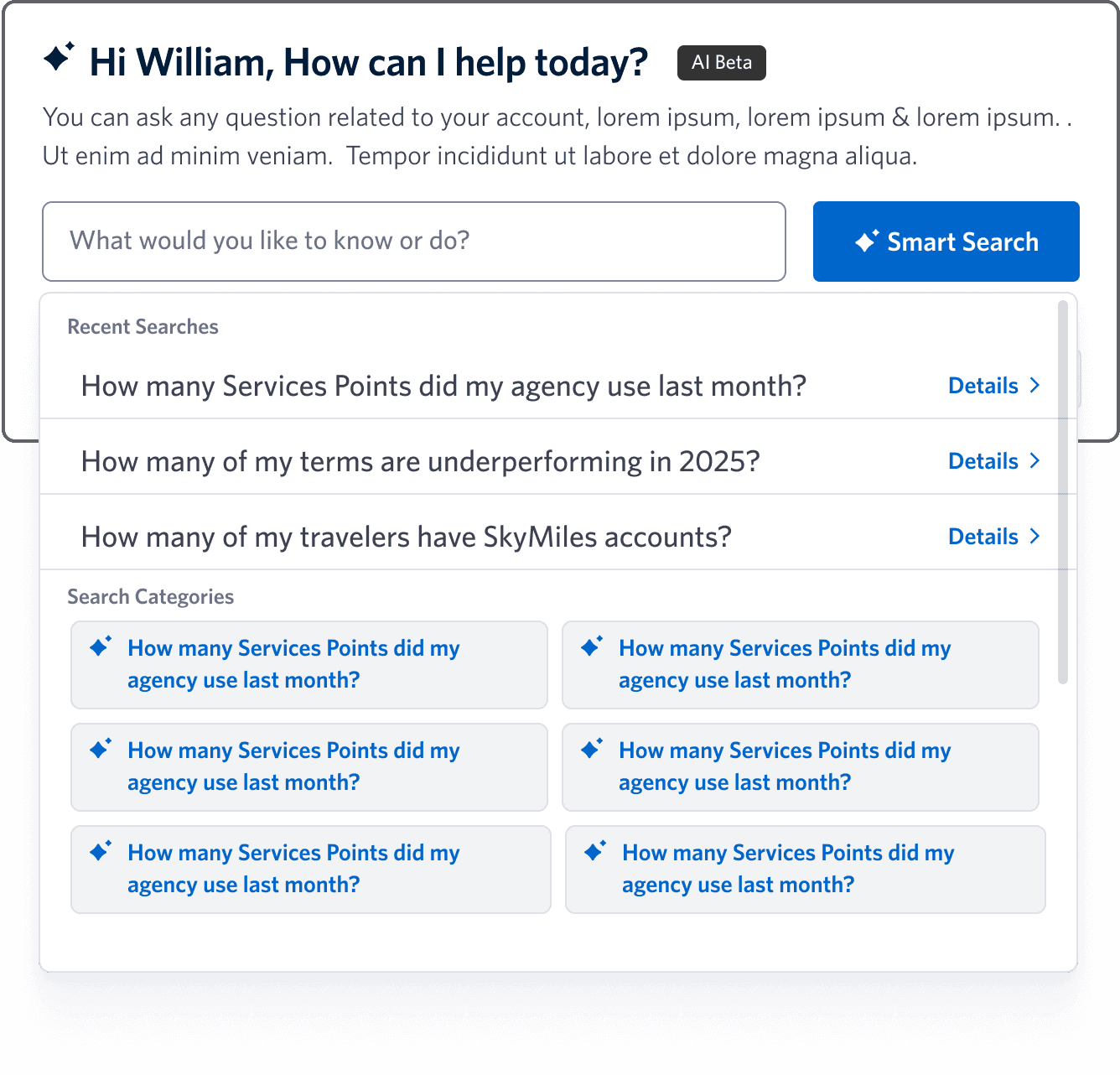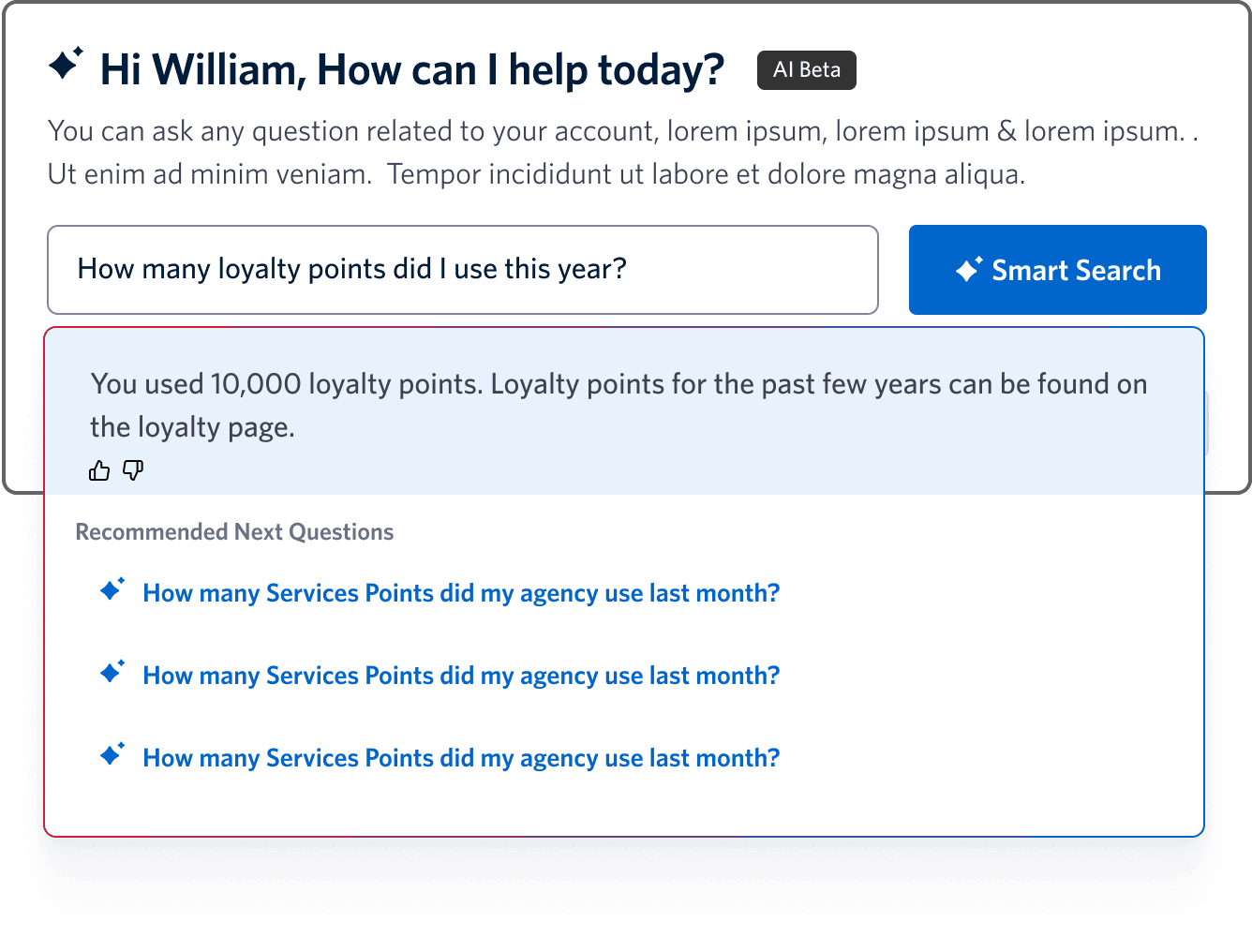 AI is introduced in the dashboard as a beta feature, allowing users to quickly find key data without needing to dig through views. For MVP 1, the scope of the search components is limited to just reporting questions, which means the design had to keep expectations clear but open the door for future capabilities.